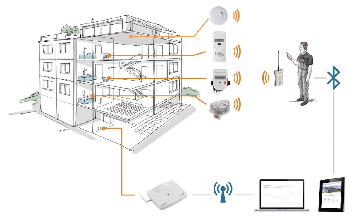 - Sicher – Das Funksystem operiert in der Standard-Version auf einer Frequenz von 433 MHz und einem proprietären Funkprotokoll von Sontex. Die Geräte senden nur bei Bedarf und können via Funk konfiguriert werden.